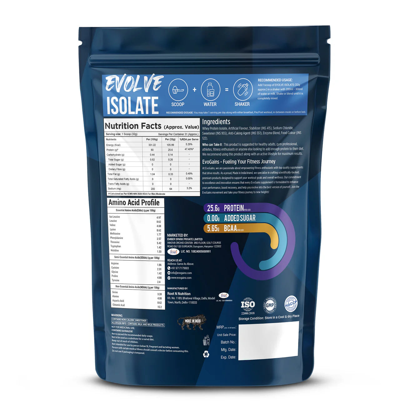 Fuel Your Gains with Evolve Isolate Protein! Unlock peak performance and lean muscle growth with Evolve Isolate Protein by EvoGains! Packed with ultra-pure, fast-absorbing protein, Evolve Isolate is designed to give your muscles the nutrition they need to recover, grow, and stay lean. Low in carbs and fat, this premium isolate is perfect for those looking to build muscle, boost recovery, and maintain a clean, powerful physique. High-Quality Protein: Delivers a potent dose of pure protein with minimal carbs and fats. Fast Absorption: Fuels muscles quickly, making it ideal for post-workout recovery. Lean Muscle Support: Helps you build muscle while keeping your body lean and defined. With Evolve Isolate Protein, you’re getting premium quality for serious results. Perfect for athletes, bodybuilders, and fitness enthusiasts dedicated to achieving their best physique. Transform your workout routine and power up with EvoGains!